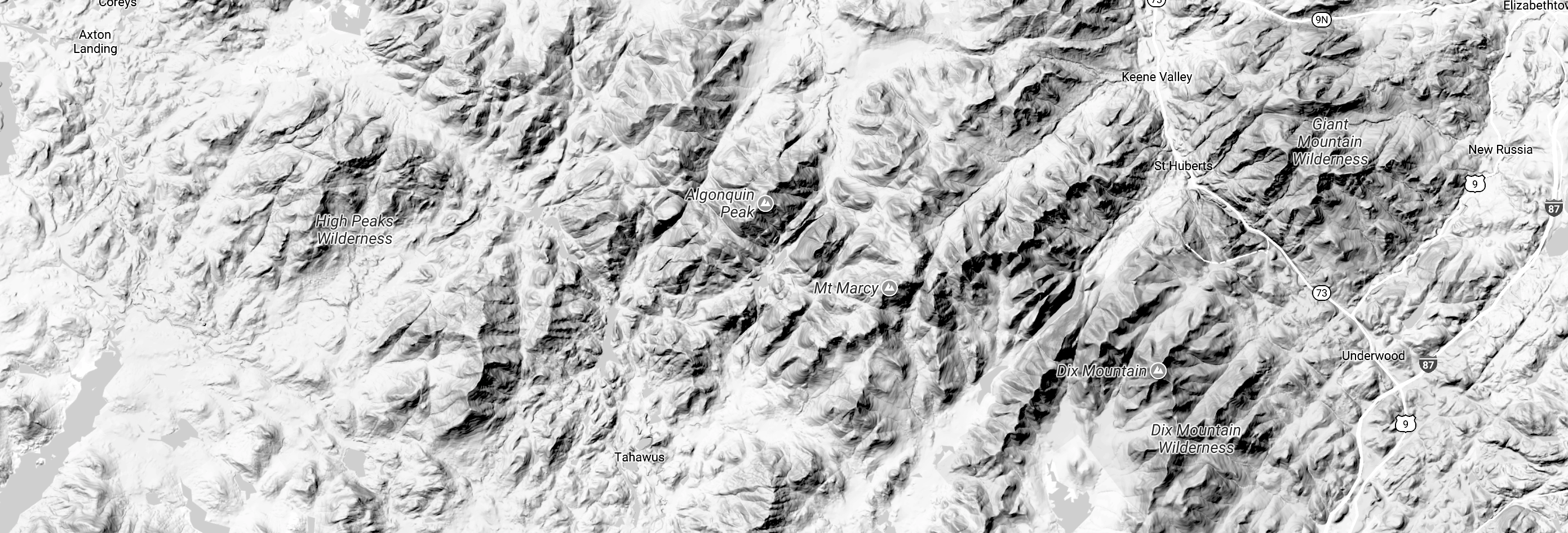 Stylized relief map of the High Peaks Area from Google Maps.