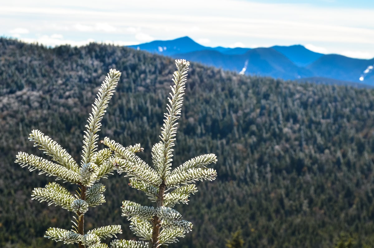 The weather can change dramatically as you go up a High Peak. Even past summer, ice from last winter clings to trees on the top of Cascade Mountain.
