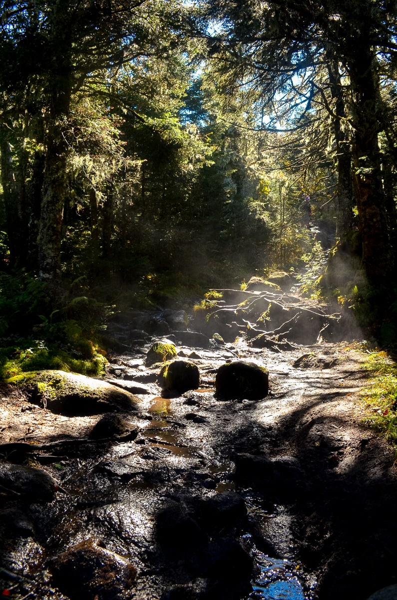 There is only one way up the top, and it is via fantastic trails that snake up the mountain, crossing a variety of ecological zones before ending in the Alpine wastes at the top. Early morning mist on the lower sections of the trail up Cascade and Porter Mountains is captures in the sunlight: