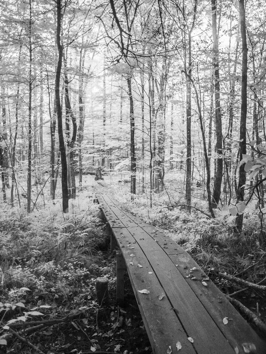 Infra-red image of the path up Rooster Comb Mountain. Under infra-red light, leaves turn bright while wood turns dark.