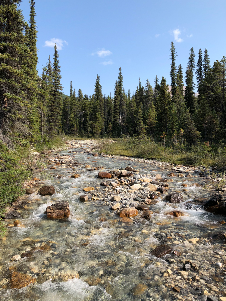 The hike starts easily, following the ominously named Mosquito creek for a few miles. The trail meanders through tall stands of conifers, occasionally skirting the creek and giving us views like this.