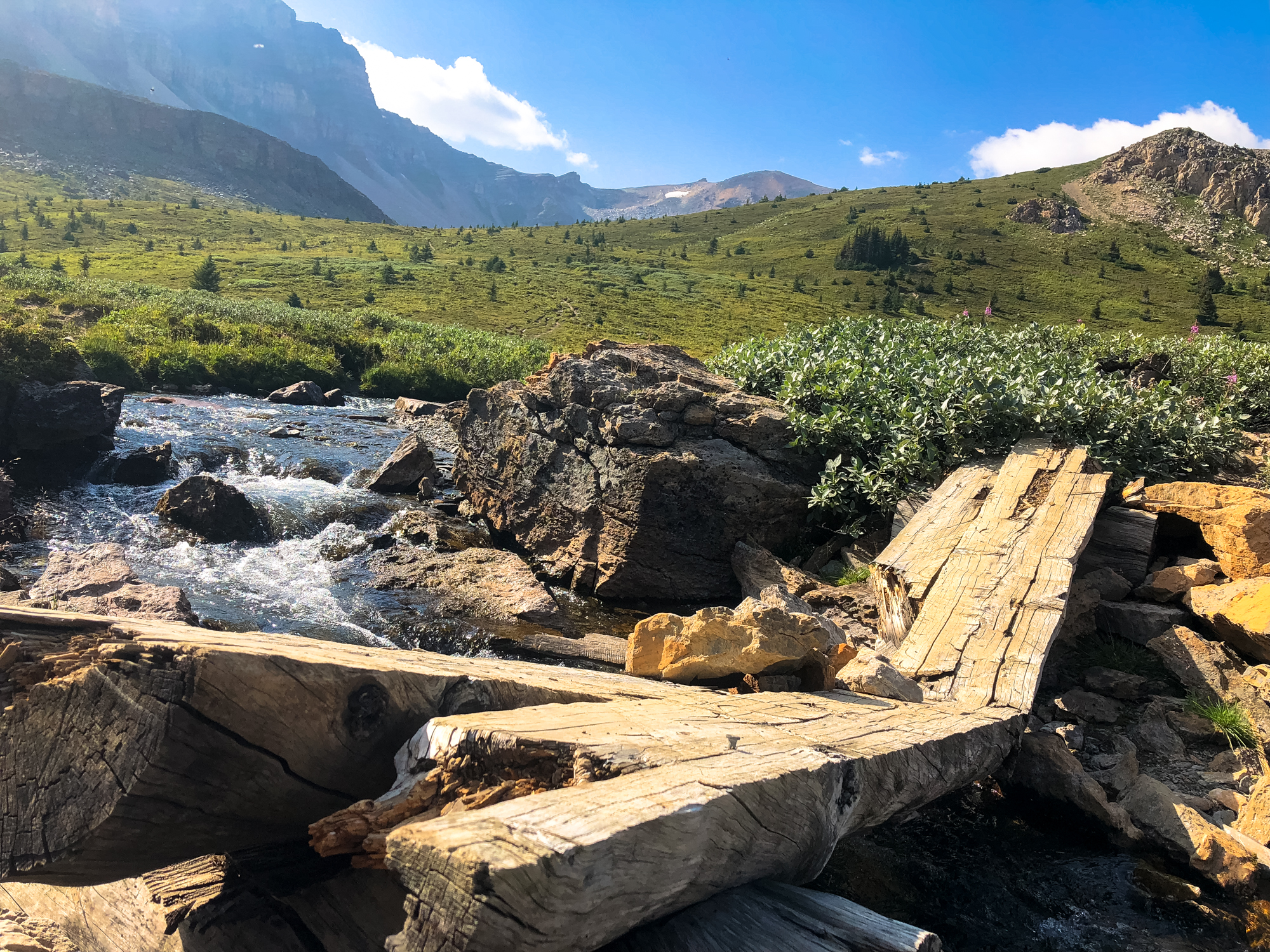 A long climb down the scree field on the other side, we find ourselves in another green valley, with another creek, that we crossed using sturdy bridges such as this one: