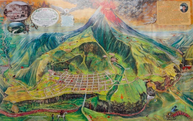 The thermal springs town of Baños spreads out in a valley beneath an active volcano called Tungurahua, shown erupting in this dramatic if uninformative map. In October 1999, Baños was evacuated when Tungurahua threatened to erupt once more.