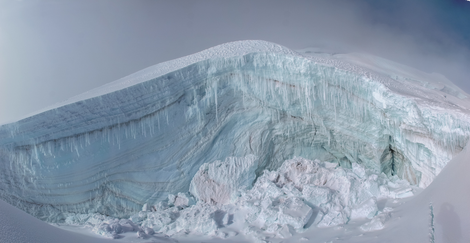 Ice wall with icicles. You can see my shadow on the right as I take the picture.
