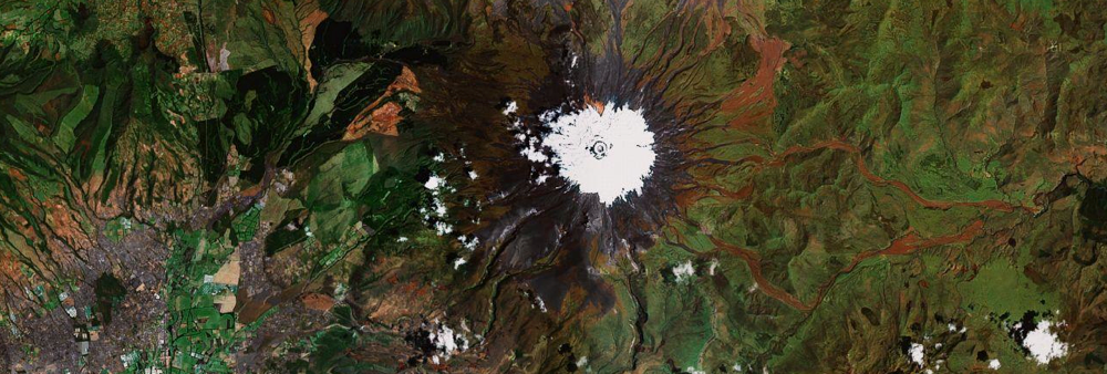 Satellite imagery showing Cotopaxi. The town on the left is Latacunga.