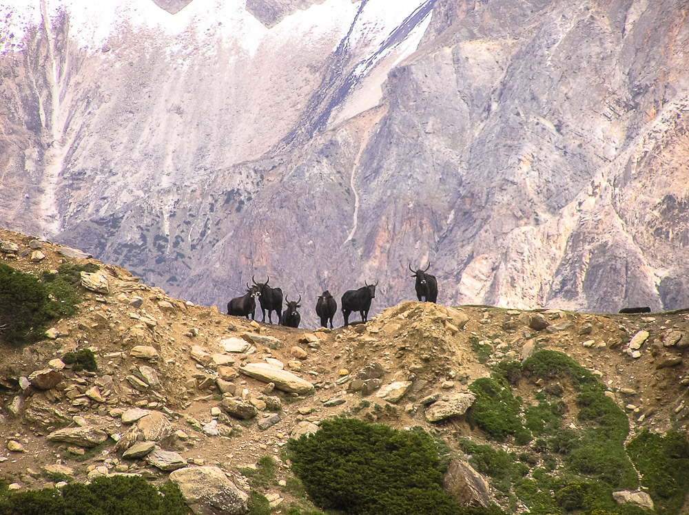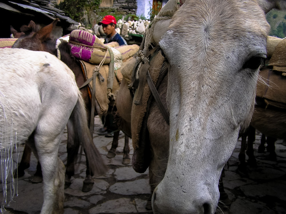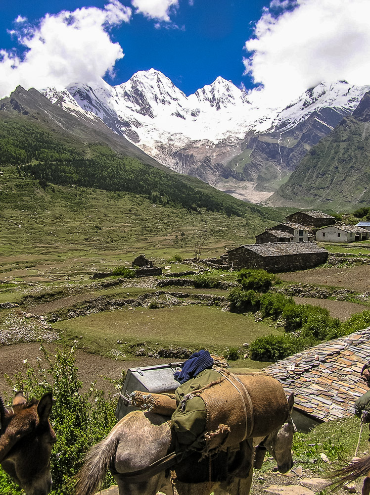 Soon afterwards, we catch our first glimpse of the Panchachuli. Donkey for scale.