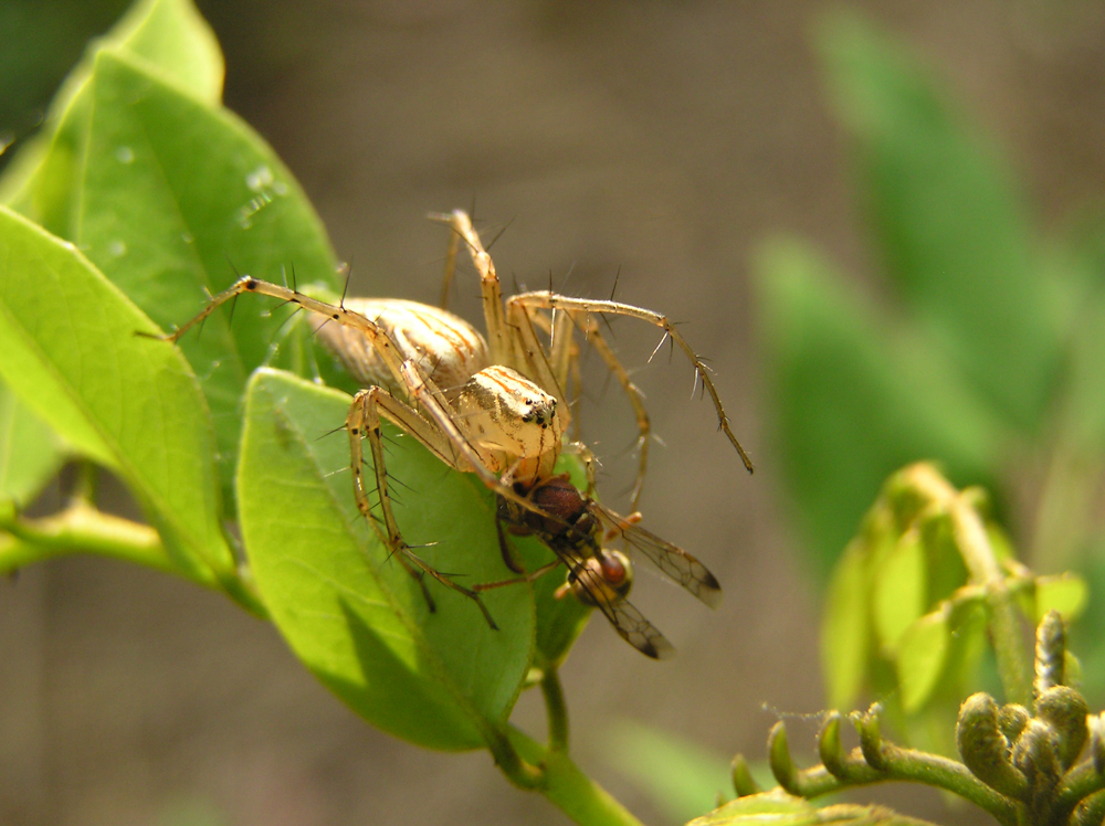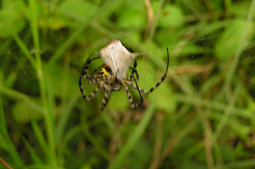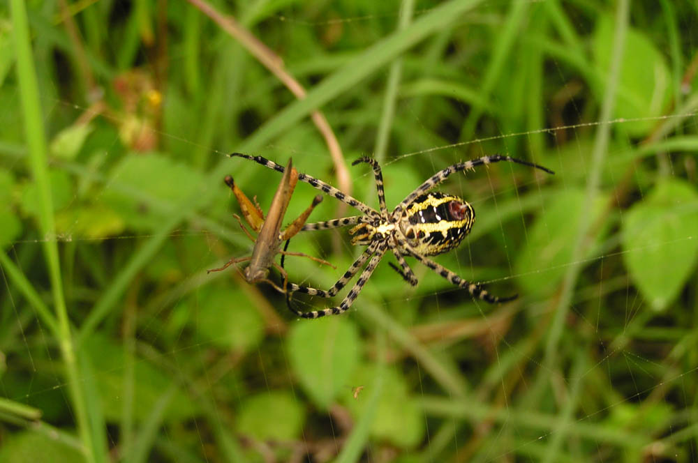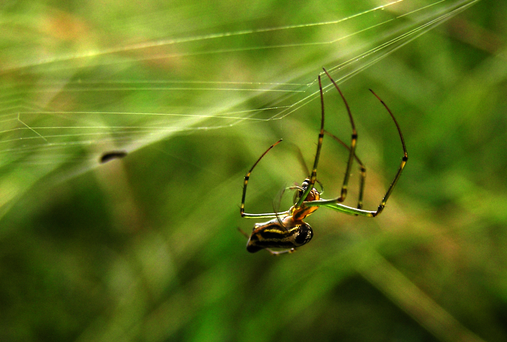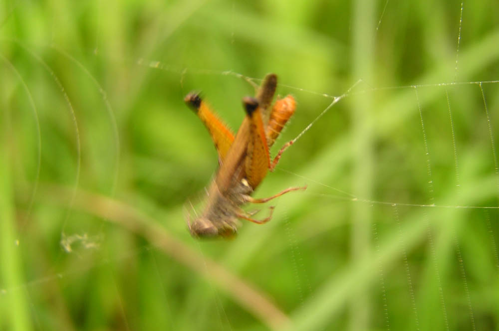 She quickly reaches Grassy McHopperface, and brings an end to his wild thrashing with a quick, paralyzing bite. She learnt this trick from a fantastic nature documentary featuring her aunt Shelob.