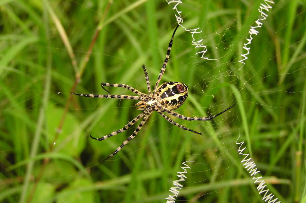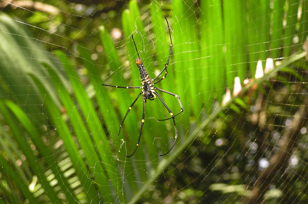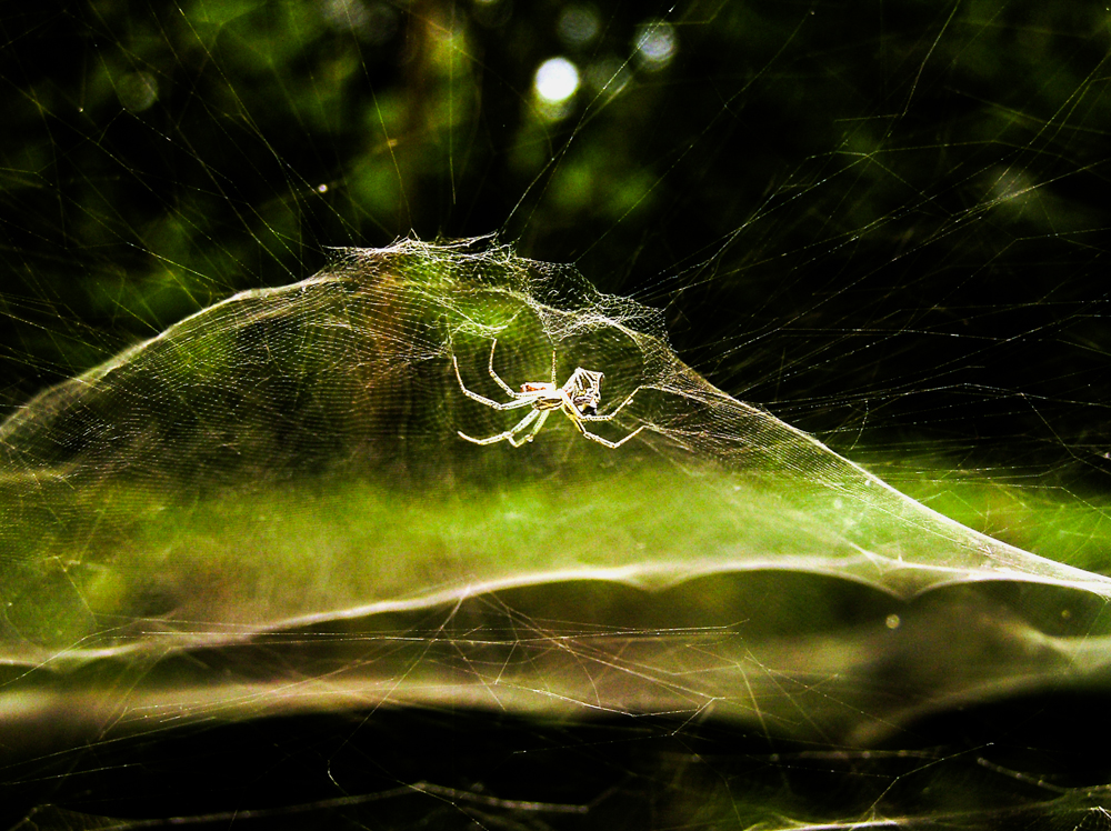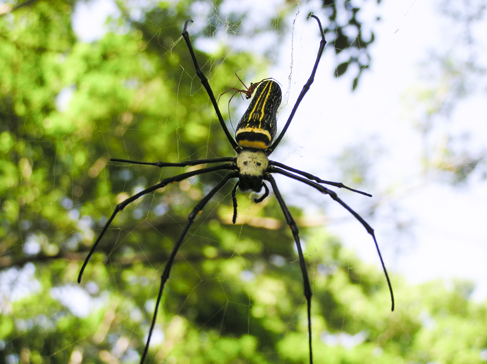 There are too many spiders to include here; but here are some of the weirder ones. This spider spins elaborate webs that consist of two parts: a flat, dense lower portion, and a tent-like portion that she lives inside of that floats above. I have heard claims that these spiders trap their prey by springing the upper tent-like portion down, but have never seen them feed, so cannot confirm this.