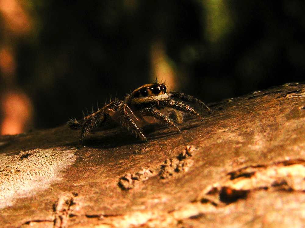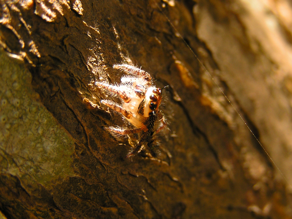 Not all spiders spin orbs, and hunt actively, moving quickly and jumping onto their prey. They are typically small, and have powerful legs and sharp eyes to spot distant prey. Here is a jumping spider with his line of safety silk, making the rounds on his favorite tree for some tasty critters.