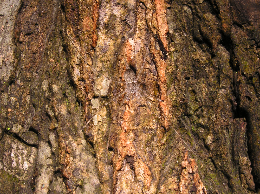 Can you spot the spider? I couldn't either, at first, and only discovered these by accidentally leaning on the tree and have them scuttle down my shirt. I think this is the same species that was lunch for my jumping spider (though this specimen is much bigger).