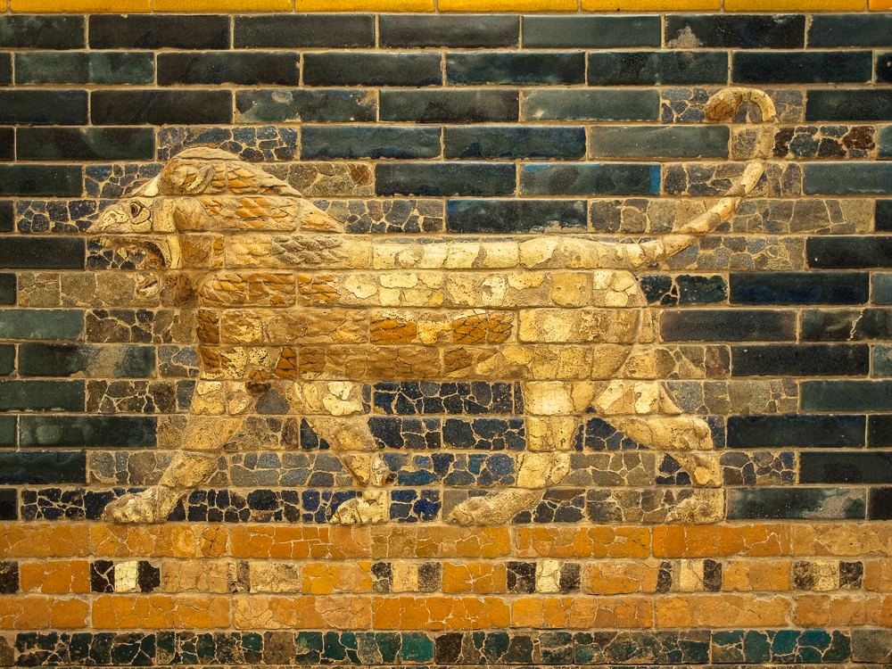 The Ishtar Gate, one of the seven wonders of the ancient world, constructed on the orders of King Nebuchadnezzar II in 575 BCE. Dedicated to the Babylonian goddess Ishtar, it was constructed using glazed brick with alternating rows of bas-relief mušḫuššu (dragons) and aurochs (ancient bulls), symbolizing the gods Marduk and Adad respectively. It's now exhibited in the Pergamon Museum, Berlin.