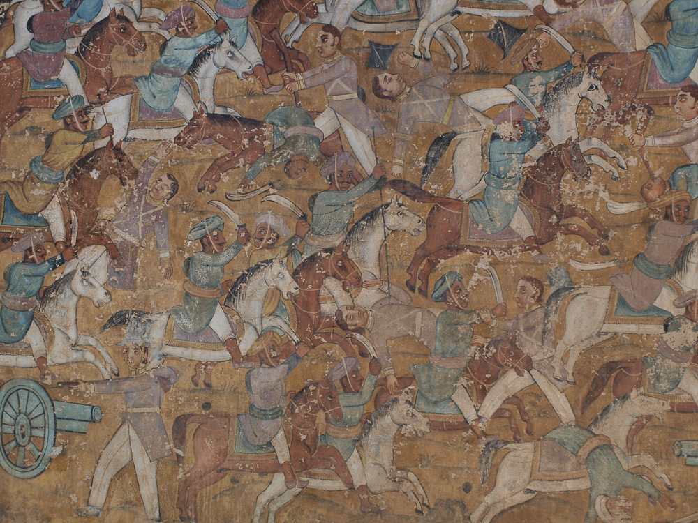Mural on wall of Tipu Sultan's palace, showing a glorious battle where he kills all the evil British. Notice the white soldiers in various degrees of discomfort.