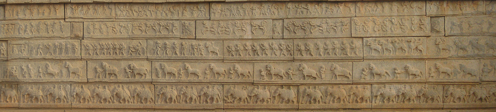 Panorama of carvings on the ruins of the Hazara Rama Temple, Hampi.