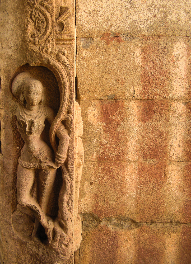 A pillaged statue guards what once used to be the entranceway of the Vittala temple. You can still see the red and white vertical stripes that temples are painted with. The breasts of this statue, considered especially obscene by the Muslim invaders, have been cut off.