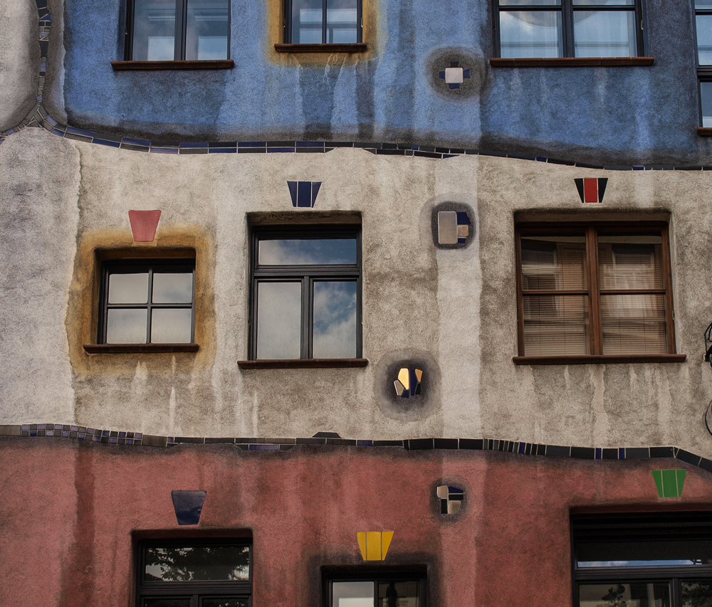 A wall makes a tempting canvas: large, flat, and strategically located. Sometimes the architect recongises the potential of the wall to be an expressive medium, and not just a vertical flat structure that seperates inside from outside. One such example is the Hundertwasser Haus in Vienna, where the wall becomes a living expression of the philosophy of the architect.