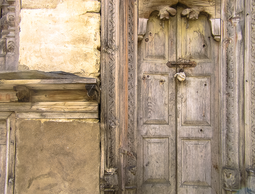 A locked door to a house in a nameless village in the lower Himalayas. The farmers and shepherds who live in this valley only live here in the summer, and go down to the plains in the summer. The lock is wrapped in cloth to prevent damage during the winter months.