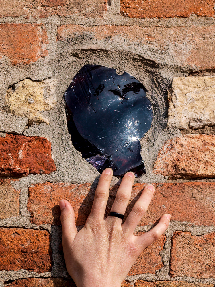 An unfinished brick wall in Murano, near Venice, Italy. A globe of black glass is embedded in the wall, perhaps an superfluous piece from the glass makers'.