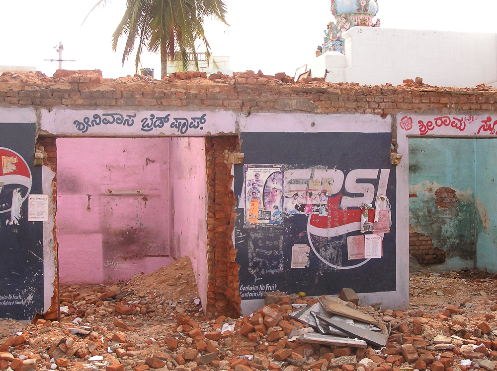 The ruins of Srinivas Bread Shop, on what is now called the New Airport Road in Bangalore, India. There is a price for wider roads that you want to build to impress the White Men as they gets off their plane; and that is this: