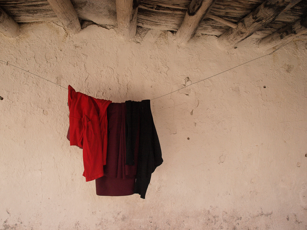 In Shey Monastery, near Leh, Ladakh, India, a monk's robes hang to dry in the desert air.